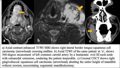 Role of imaging: Surgery is the mainstay of treatment for oral cavity cancers provided there are no contraindications on imaging. Mucosal lesions are directly visualised by the surgeons, however, the role of imaging lies in delineating the submucosal and the entire extent of the lesion, providing information on perineural spread, extent of bone involvement, degree of vessel encasement, status of cervical lymph node, and possible infiltration of prevertebral fascia. Oropharyngeal cancers, on the other hand, are usually treated with chemoradiotherapy, for which, delinating the entire extent of lesion on imaging along with staging, are crucial. However, T1/T2 non-midline cancers are amenable to transoral robotic surgery (TORS), provided there is no infiltration of superior pharyngeal constrictor muscle or parapharyngeal space, and there is no medialization of internal carotid artery.